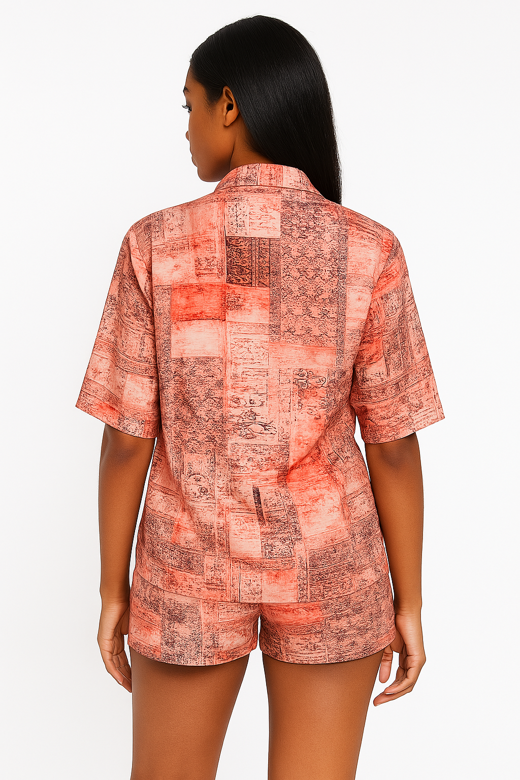 Get ready for sunshine and adventure with our stunning Coral Desert Print Trio. This versatile three-piece matching set is your new go-to outfit for warm-weather relaxation and effortless chic. Featuring a captivating abstract desert-inspired print in beautiful coral, terracotta, and earthy tones, this co-ord set offers multiple styling options.