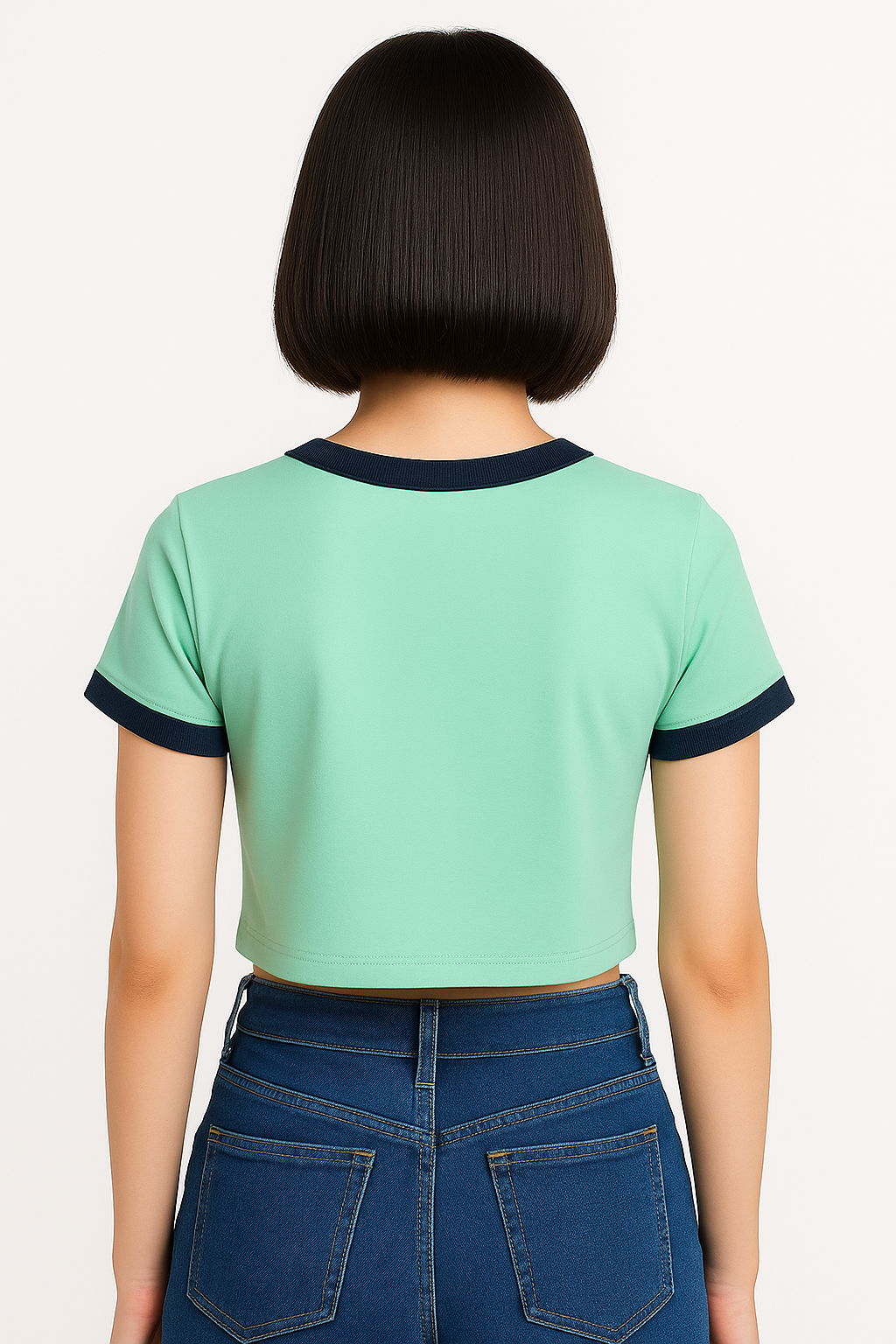 "A refreshing take on casual style, this mint green crop top features contrasting navy blue trim at the neckline and sleeves. The 'KINTELA' logo displayed prominently across the chest adds a contemporary brand statement. Made with soft, comfortable polyester, this versatile ringer-style crop tee pairs perfectly with high-waisted jeans for an effortlessly trendy look
