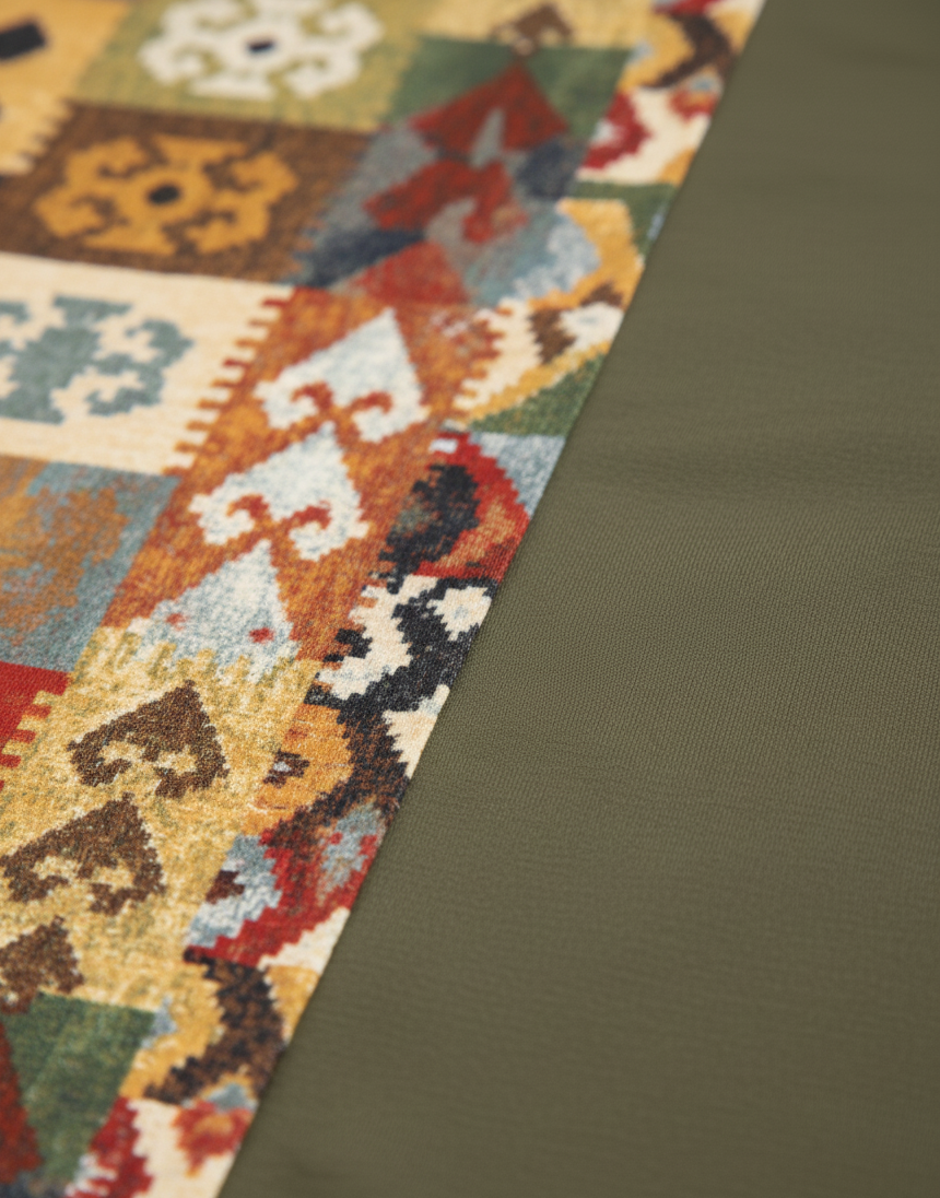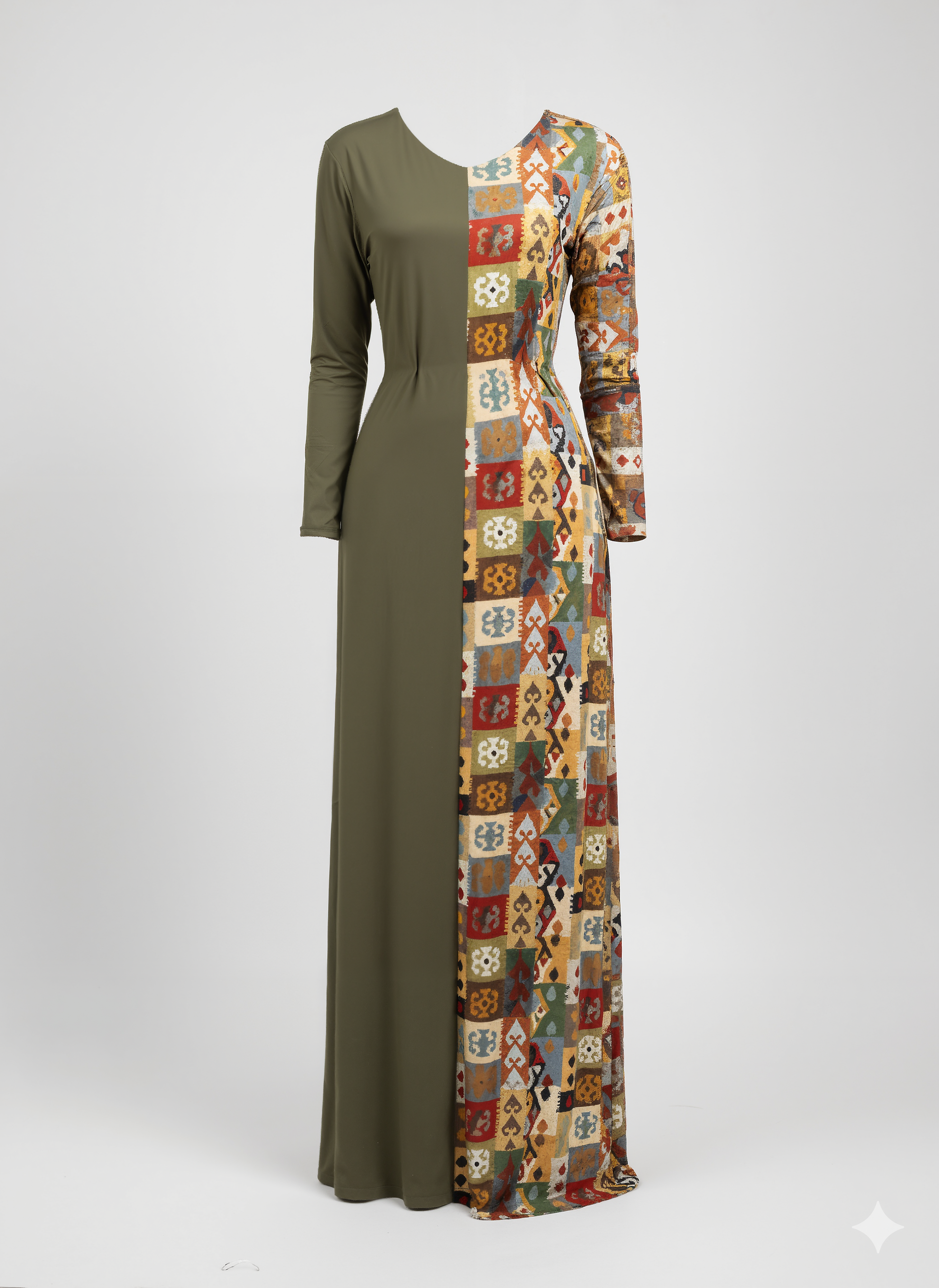 A statement maxi with an easy, flattering drape. One side is a rich olive panel for a sleek, lengthening effect; the other features a vibrant mosaic print that wraps around the back for full impact. A soft V-neck, long sleeves, and a removable self-tie belt finish the look. Made from softened polyester with gentle stretch, it’s comfy enough for all-day wear and polished enough for evenings out.